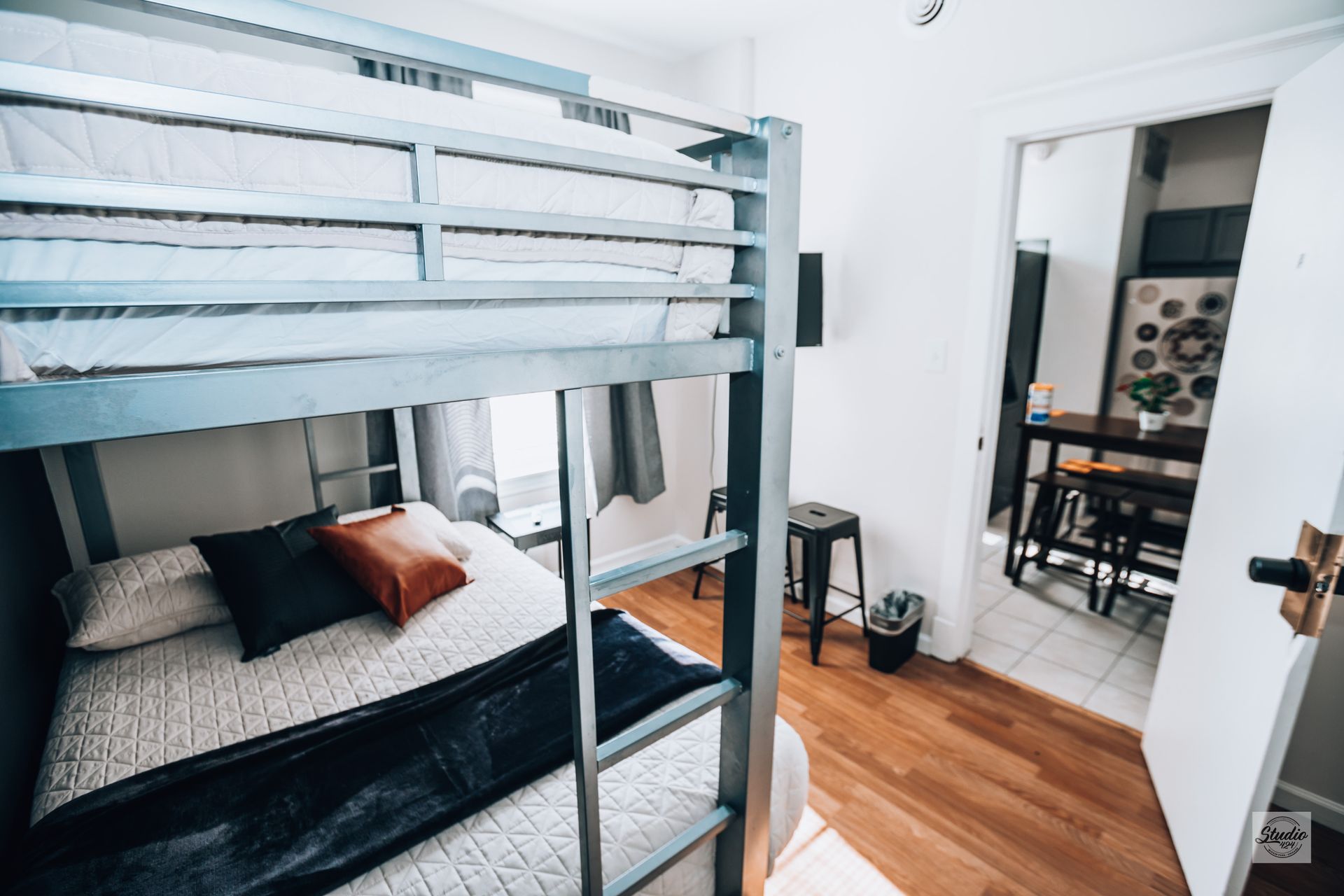 Discover the charm of versatility and coziness in this unique space. With a full-size bed on the bottom bunk and a twin-size bed on top, it accommodates multiple guests comfortably. Stay organized with a practical closet and shelf. Enjoy entertainment on the TV, and find extra seating on two stools. A 5-foot mirror adds a spacious feel, and a nightstand with a charging outlet keeps you connected. Guests love the character of the bunk bed setup and appreciate the cozy atmosphere and thoughtful amenities and its the closest room next to the kitchen.